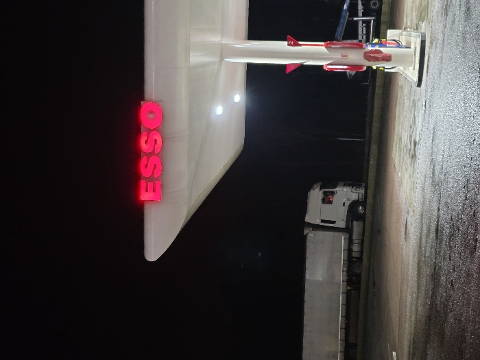 n Esso gas station at night. The red "ESSO" sign is illuminated on the station's canopy. A white semi-truck is parked at the gas station, and a wet concrete surface is visible. The lighting is generally dark, with the bright gas station sign providing the main source of illumination.