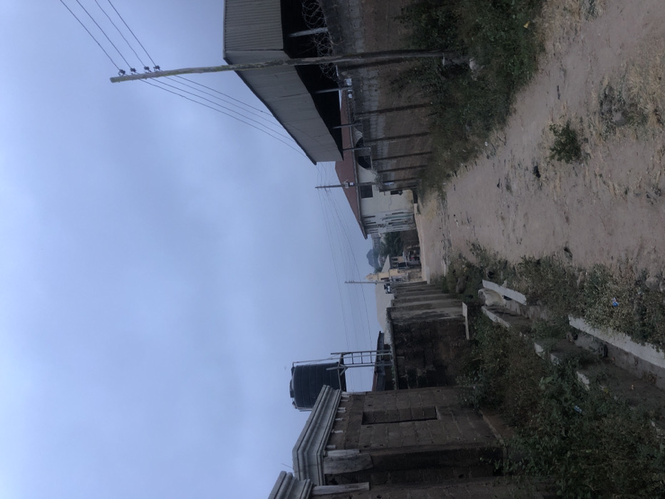 A sideways view of a dirt path winds between buildings and foliage under a cloudy sky. A large industrial structure with barbed wire along its top edge stands to the left. Utility poles line the path with power lines stretching overhead. A partially constructed building with a water tank is visible in the foreground. Vegetation overgrows the edge of the path and around the buildings. The light suggests early morning or late evening.
