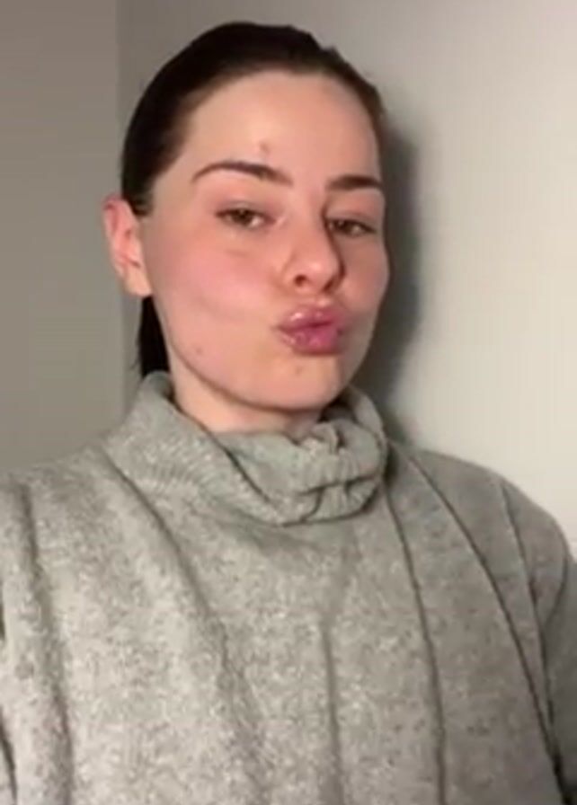 A fair-skinned woman with dark hair pulled back is centered in the frame against a white or light grey wall. She is wearing a light grey, thick knit turtleneck sweater. She has a blemish on her forehead and what appears to be discoloration under her eyes. Her fingernails are metallic silver and relatively long. She puckers her lips and blows a kiss toward the viewer, with her hand outstretched and palm facing the camera.