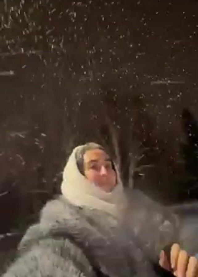 A woman wearing a light-colored headscarf and a grey fur-like coat stands outside in the snow. The lighting is artificial, illuminating the falling snow. The woman looks up at the falling snow, smiles, and laughs. The scene appears to be at night.