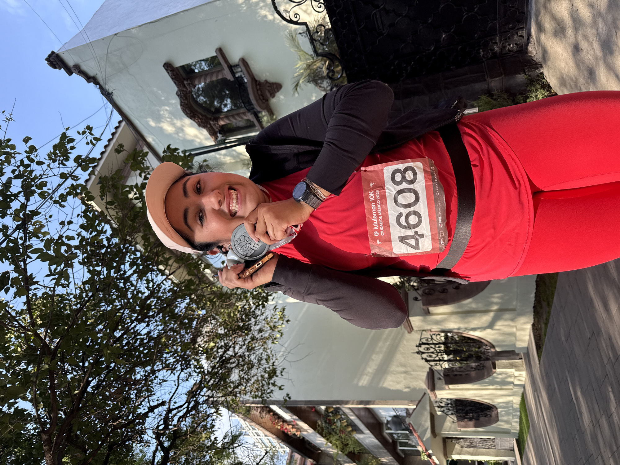 A woman wearing a red athletic shirt, black long sleeves, and a beige baseball cap, stands outside, holding a silver medal. Her race number, 4608, is visible on the front of her shirt, indicating a Lululemon 10K race in Mexico City, Mexico, in 2026. Behind her is a two-story building with detailed wrought-iron balconies and a tree with dense foliage. The sky is blue. She appears to be smiling and proud of her accomplishment.