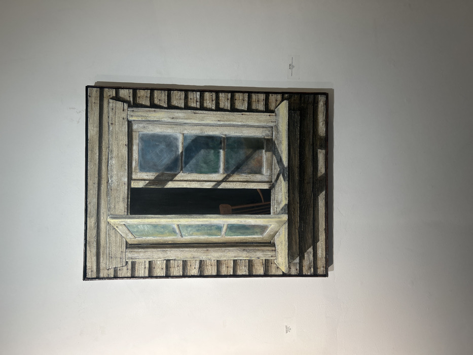 A framed painting depicting an old, weathered wooden window with a partially opened lower sash