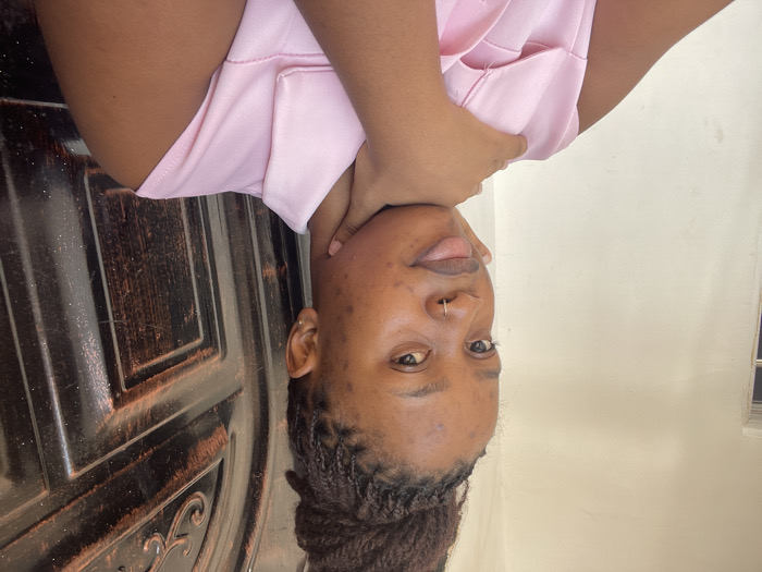 A female individual is centrally featured in a close-up, waist-up portrait, situated within what appears to be a residential or commercial building in Okpanam, Nigeria. She exhibits a medium-dark complexion, dark eyes, and dark dreadlocks styled into a high bun. A small, silver-colored ring pierces her left nostril, and a stud earring is visible in her right earlobe. She is dressed in a light pink, sleeveless collared blouse with layered fabric detailing on the front. Her right hand is positioned beneath her chin and jawline, supporting her head, as she maintains direct eye contact with the camera. The background on the left consists of a plain, light-colored wall with a partial view of a window frame. To the right, behind the subject, stands a dark, ornate door featuring raised panels and decorative scrollwork, exhibiting a weathered appearance. Illumination suggests natural daylight.