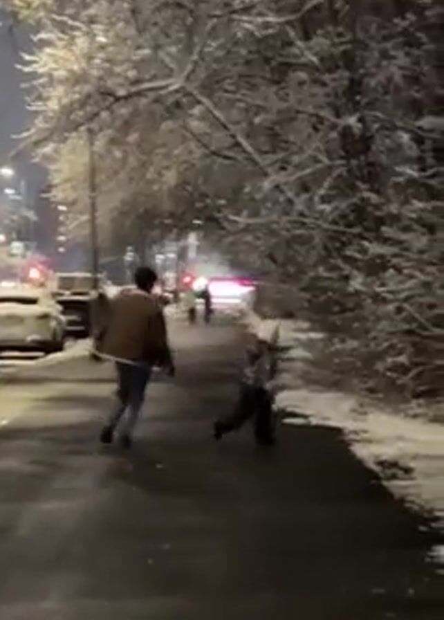 A man and child are running along a sidewalk in a snowy, urban environment at night. The man, dressed in a brown coat and jeans, is slightly ahead of the child. The child, wearing a winter hat and coat, is trailing behind. The sidewalk is lined with snow-covered trees. Streetlights illuminate the scene, and parked cars are visible in the background. The man throws a snowball. The child continues to run.
