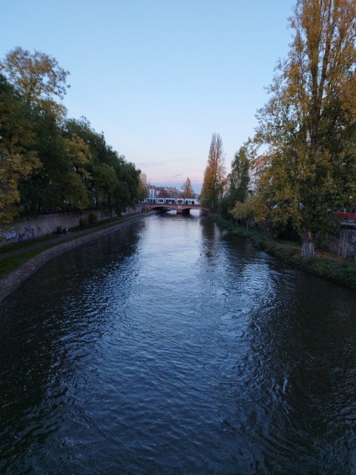 The image displays a view along the Ill River in Strasbourg, France, oriented generally towards the northeast