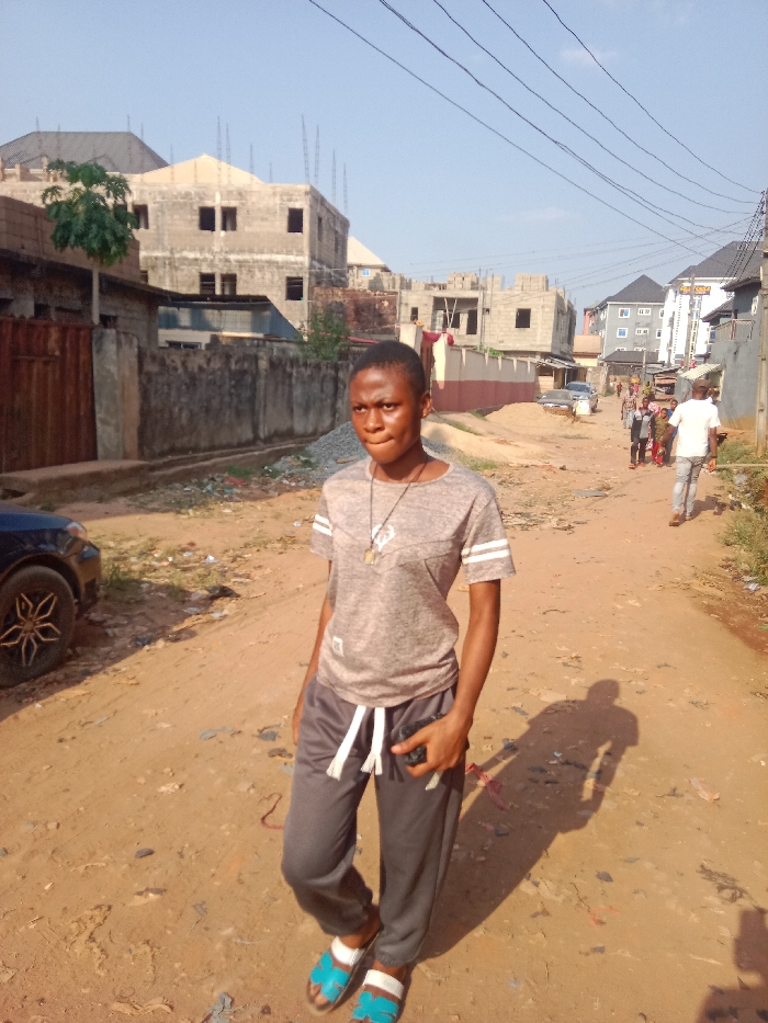 A young person stands on a dirt road in a residential area. They are wearing a gray t-shirt, gray sweatpants with white drawstrings, and blue sandals. Several buildings are under construction in the background. There is trash and debris scattered along the side of the road. In the distance, several people are walking. Overhead power lines are visible against a clear sky. A black car is parked to the left of the young person.