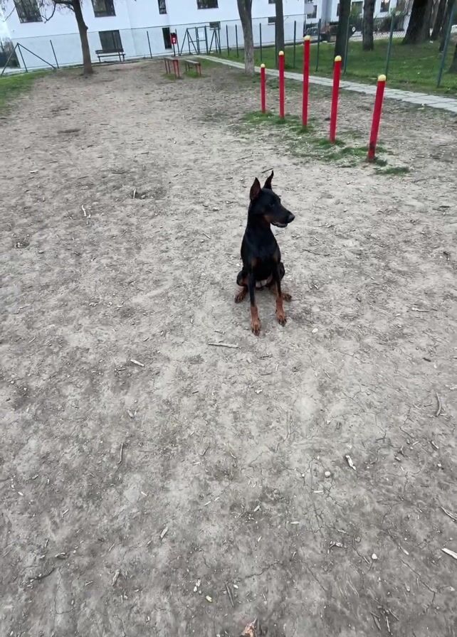 - "A black Doberman dog is sitting on a dirt-covered area in a park-like setting" by FM-EpCxW2, licensed under CC BY 4.0