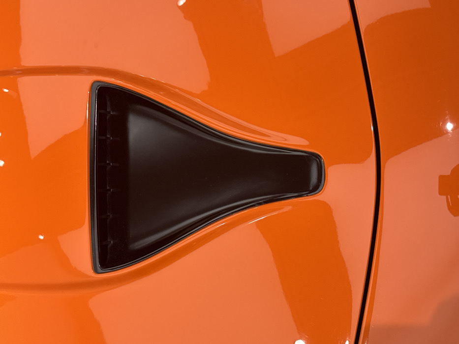 The image displays a detailed, close-up perspective of the vibrant orange, high-gloss hood of a vehicle, located indoors in Rho, Italy. A prominent, centrally positioned, black triangular air intake or vent is recessed into the hood, featuring a horizontal grate at its uppermost edge. The highly reflective orange surface exhibits multiple distinct white specular reflections, indicating artificial lighting. In the lower-central area, a distorted, reddish-orange reflection, consistent with a human form or object, is visible. A thin, horizontal black seam or panel line extends across the lower portion of the hood, separating the panels. No direct human subjects or specific actions are depicted.