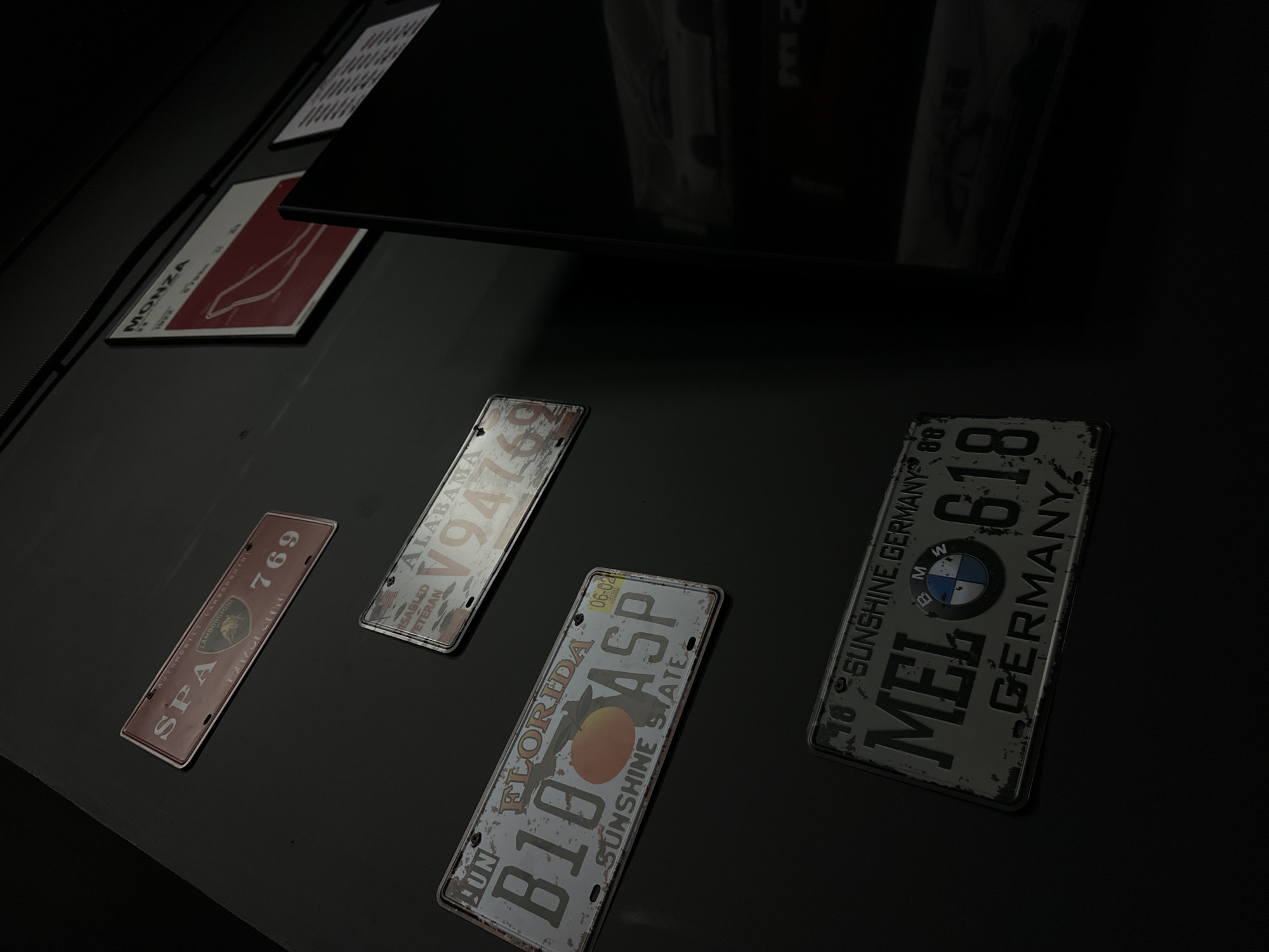 The image displays a collection of license plates and car-related decor affixed to a dark, possibly reflective surface. The license plates, arranged at various angles, represent different regions and vehicles. These include license plates for "SPA AUTOMOBILI LAMBORGHINI 769", "ALABAMA V94769", "FLORIDA B10 ASP", and "SUNSHINE GERMANY MEL 618". The image also includes a graphic of the MONZA car track. The environment appears to be dimly lit.