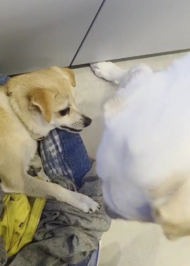 The camera's elevated perspective captures two dogs in an indoor setting. One dog, light brown in color, is lying on a pile of clothes that includes a blue patterned fabric, a yellow garment, and a gray piece of clothing. The dog is turned to its right, observing the second dog. The second dog is primarily white and positioned standing or moving beside the brown dog. It approaches the brown dog and seemingly sniffs or nuzzles it. Suddenly, the brown dog bares its teeth and barks loudly at the white dog. The white dog then moves away. The floor appears to be tiled, and a white surface, possibly a cabinet or wall, is visible in the background.