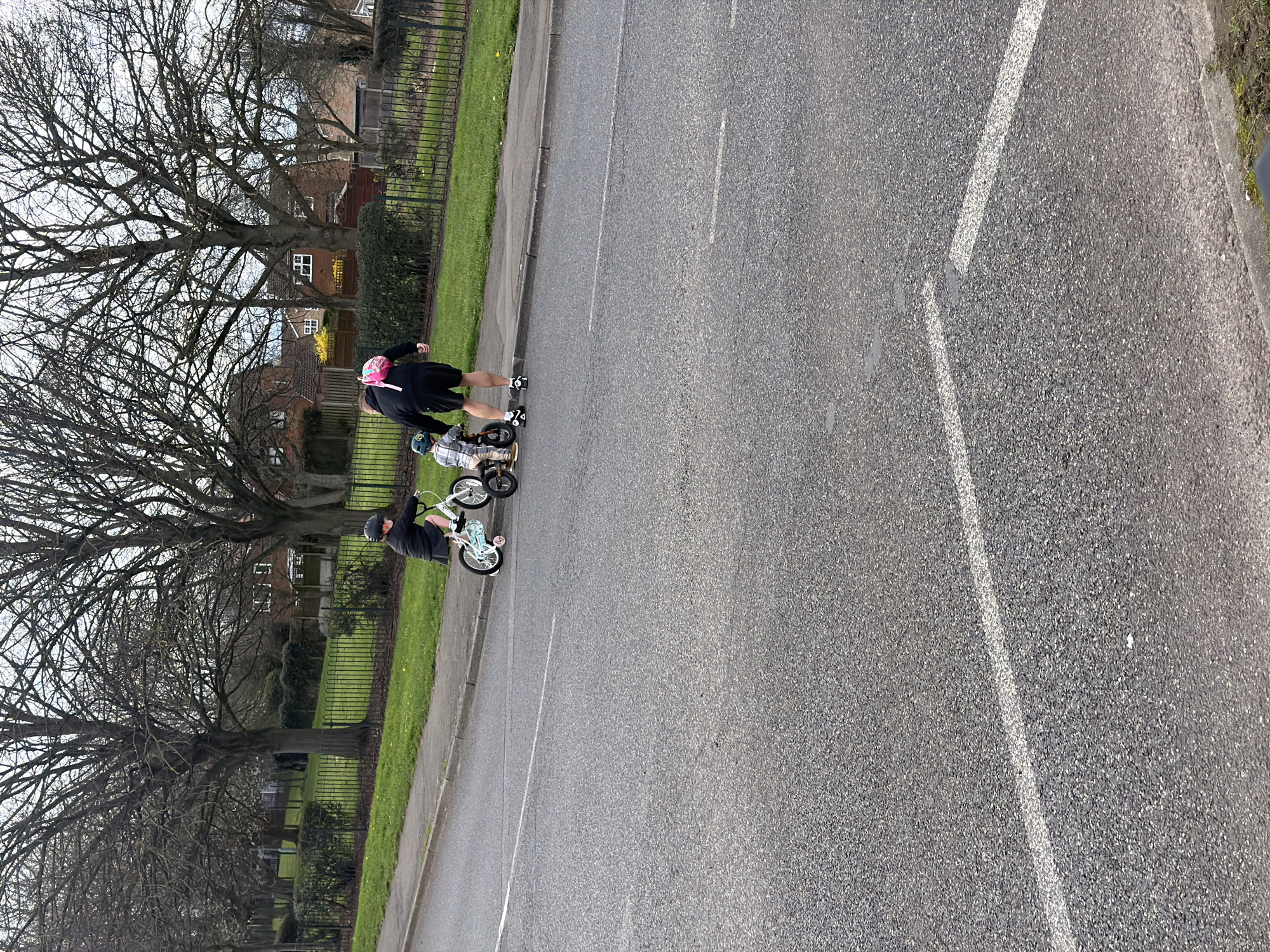 The scene is located in the city of Rotherham, United Kingdom. Three individuals are positioned on a paved footpath adjacent to an asphalt road. An adult male, wearing a black shirt, black shorts, black sneakers with white accents, and a pink backpack, is observed standing next to a young child. This child wears a green helmet and a plaid shirt, and is seated on a small orange-brown tricycle. A second child, wearing a black helmet and a dark jacket, is riding a light blue bicycle equipped with white training wheels, positioned slightly ahead and to the left of the adult and younger child. The asphalt road in the foreground displays white painted markings, including a dashed line and a solid line forming a junction or 'give way' indication. Adjacent to the footpath is a green grass verge with scattered yellow flora, bordered by a black metal fence. In the background, numerous large, bare deciduous trees are visible, indicating a non-summer season. Beyond the trees, red brick residential houses with visible windows are present. The sky above is overcast, suggesting a cloudy daytime.