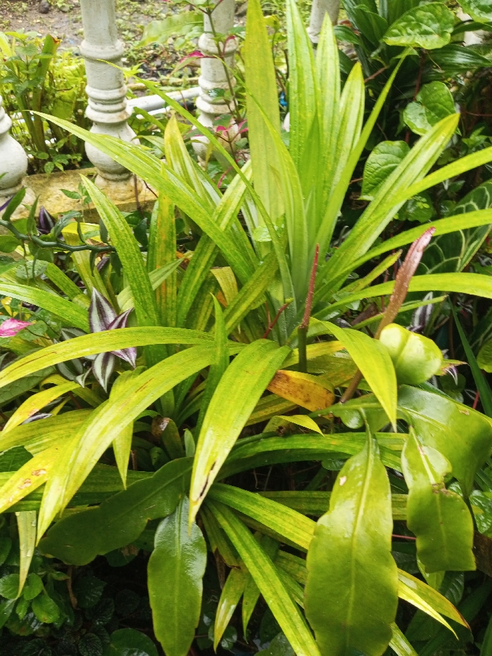 Lush foliage dominates the scene, featuring prominently the Pandan plant with its elongated, striped leaves in shades of green and yellow. Nearby, elongated green leaves hang. A slender stem extends upwards, bearing a drooping bud. Other plants with diverse foliage create a dense undergrowth, adding depth and texture. A glimpse of a white, balustrade fence appears in the background.