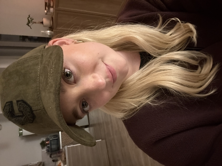 A blonde woman with green eyes is posing in a selfie. She is wearing an olive green baseball cap with a dark number on the side and a maroon sweater. Her blonde hair is flowing, and her expression is slightly smiling. The background includes a kitchen with wooden cabinets, a decorative plant, and kitchen appliances. The photo is tilted, giving a diagonal perspective.