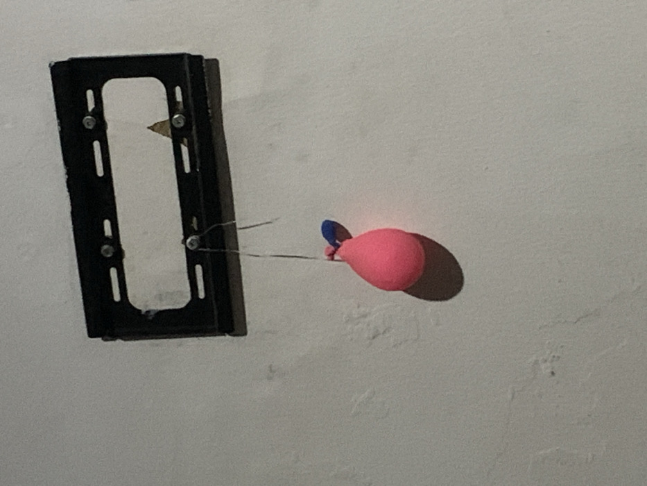 - "A pink balloon, casting a shadow, is suspended in mid-air by two thin wires attached to a black metal bracket mounted on a white wall" by FM-4hiJG3, licensed under CC BY 4.0