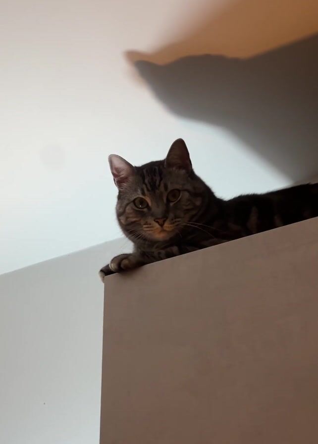 gray tabby cat lying atop a light gray or white cabinet. The cat is facing the camera with its paws resting over the edge. The background consists of a white ceiling with a soft shadow cast in the upper right corner. The scene is well-lit, focusing primarily on the cat.