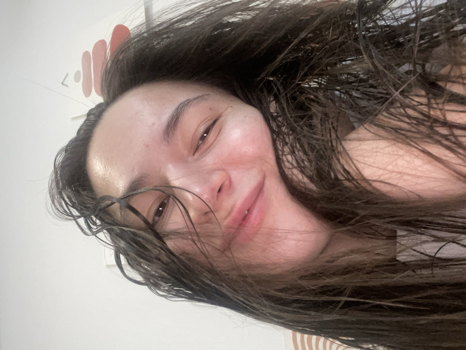 A woman with wet, dark brown hair is close to the camera, angled slightly. Her skin is fair and flushed, with a small smile on her face. Her eyes are open and looking at the viewer. A wall in the background has a minimalist design of abstract shapes and horizontal lines. The overall image has a casual, selfie-like quality.