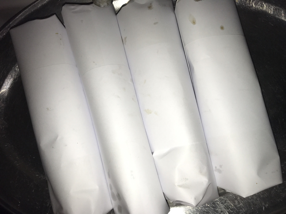 The scene, located in Galadimawa, Nigeria, displays four elongated items individually wrapped in white paper. These items are horizontally aligned and stacked within a metallic, reflective tray. The white paper surfaces exhibit numerous light yellowish-brown stains, consistent with grease or food residue. The ends of the wrapped objects show minor creasing. The metallic tray reflects ambient light, and the immediate background is dark. No individuals or dynamic actions are present in the image.