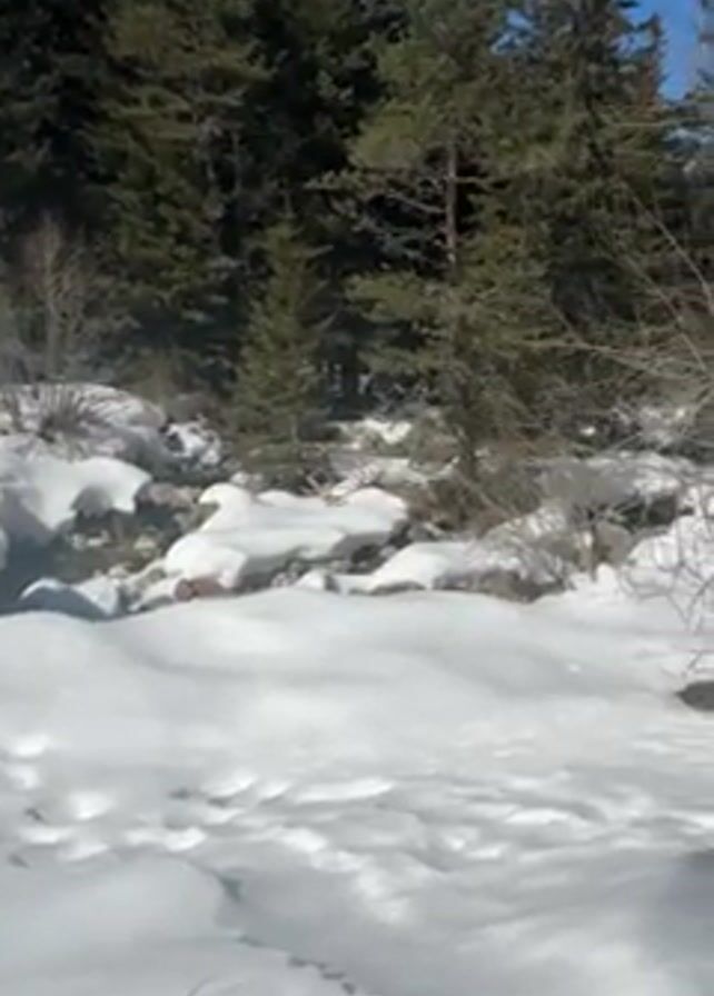 The video depicts a snowy landscape with a small stream flowing through it. The snow covers the ground and rocks, and there are trees in the background. The sky is visible and appears blue. The camera is at a low angle, capturing the scenery and showing footprints in the snow.