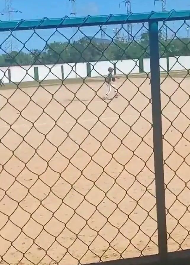baseball field with a chain-link fence obscuring the view. On the field, there are several young men playing baseball. One player, wearing a red uniform, is running towards first base after presumably hitting the ball. Another player is visible near first base, likely the first baseman. Other players are positioned on the field. The baseball field is a dirt field with white lines marking the base paths. Beyond the field, there is a white wall, some trees, and a clear blue sky with visible power lines and towers in the distance. The camera is static and focuses on the action on the baseball field through the fence.