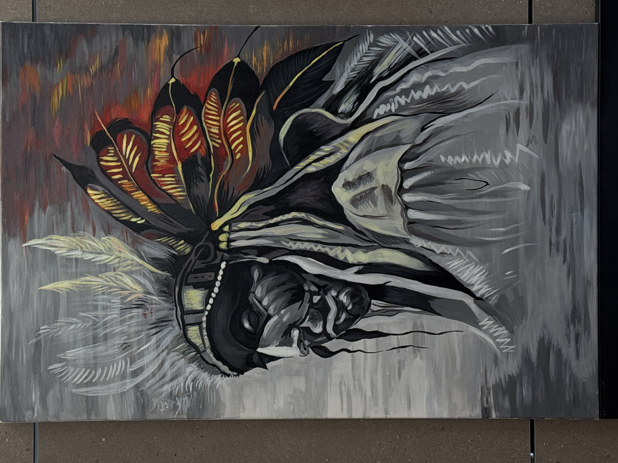 An acrylic or oil painting, vertically oriented on a rectangular canvas, is depicted leaning against a tiled wall. The painting features a stylized bust-up portrait of an individual resembling a Native American chief, presented in left profile with a downward gaze. The figure wears an elaborate headdress: the left side (viewer's left) consists of numerous white and light grey feathers, while the right side (viewer's right) displays larger, dark feathers prominently marked with red and yellow/gold. The face is rendered in shades of black and grey, exhibiting strong contrasts, suggesting a somber or contemplative expression. The visible upper garment is also in shades of grey and white. The painting's background shifts from horizontal brushstrokes in dark grey, red, orange, and yellow hues in the upper right quadrant to various shades of grey with horizontal strokes across the rest of the canvas. The canvas itself has a narrow, unfinished white border on its right and top edges. The background behind the painting consists of large, rectangular, matte grey-brown tiles with darker grout lines. A horizontal black surface is visible directly beneath the painting. The precise location within the city of Chaikovsky, Russia, cannot be determined from the provided image.