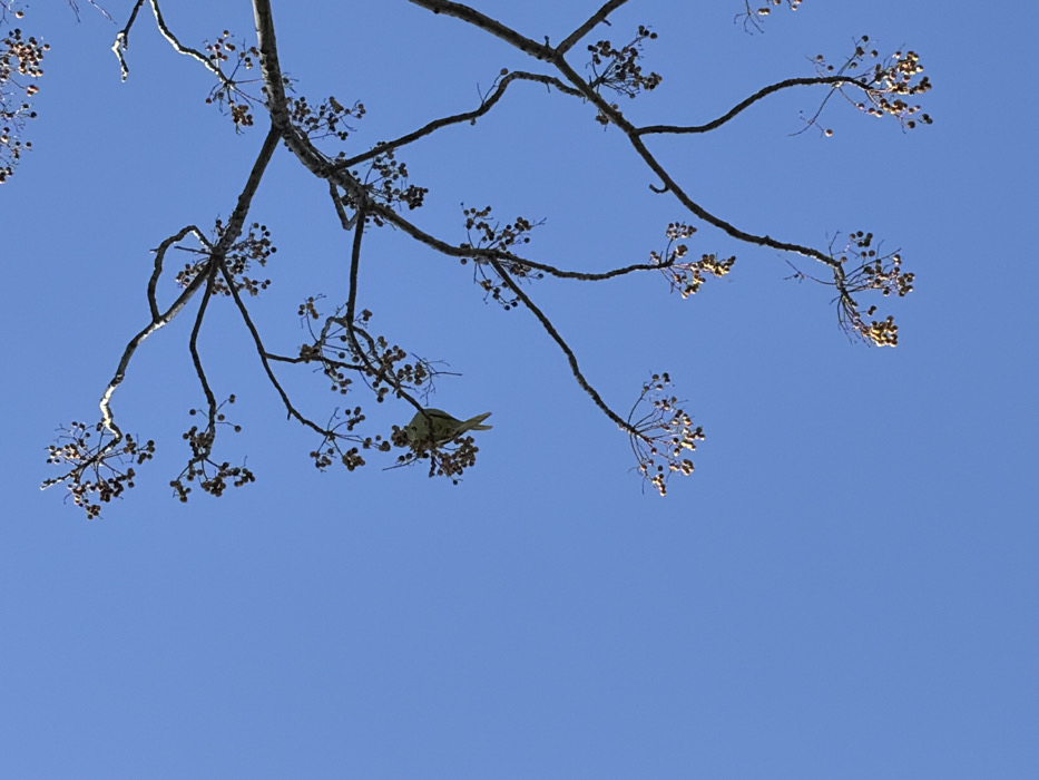 - "A small, light yellow-green bird is perched upside down on a bare tree branch, positioned in the upper-left portion of the frame" by FM-S5z7B3, licensed under CC BY 4.0