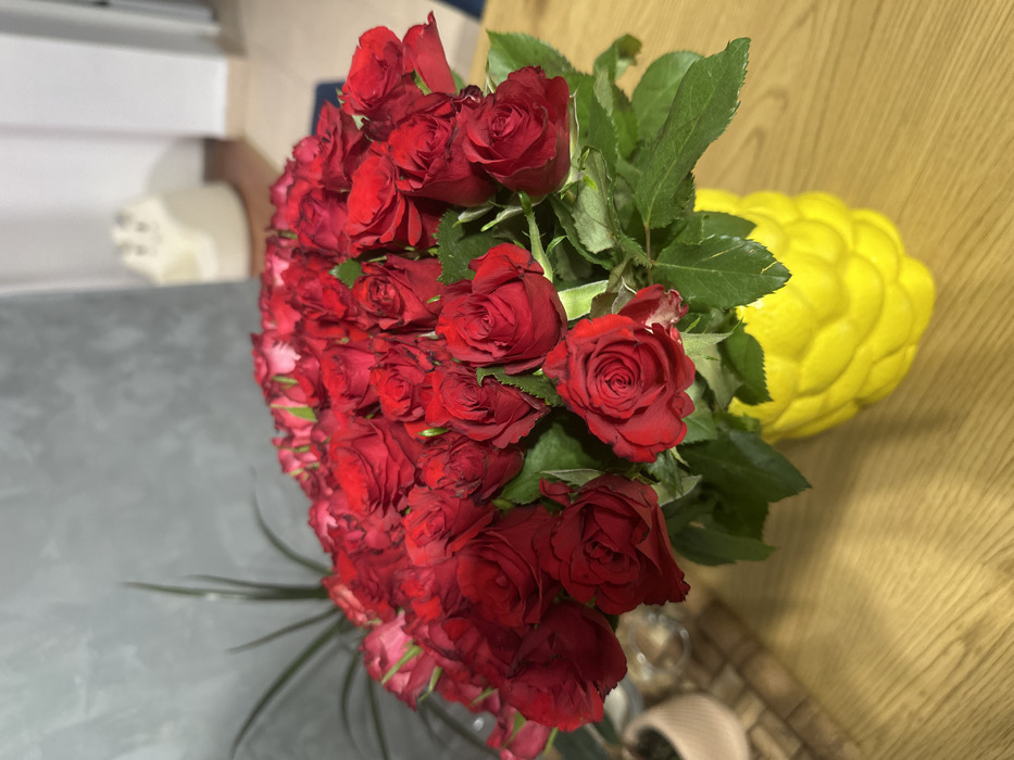 - "A dense bouquet of numerous red roses, featuring some pinkish outer petals and green foliage, is centrally displayed in a bright yellow, textured, pineapple-shaped ceramic vase" by FM-2doom2, licensed under CC BY 4.0