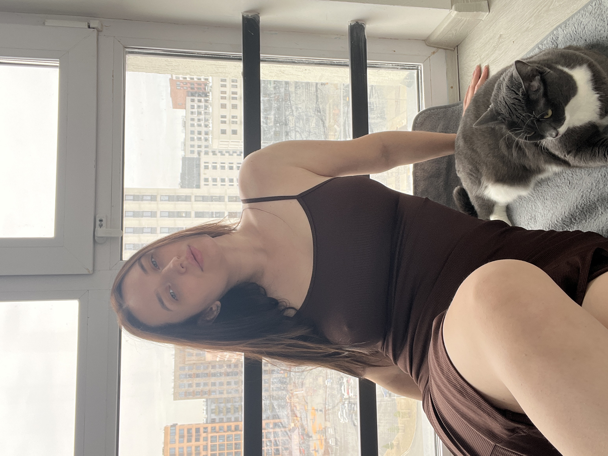 woman with long brown hair and blue eyes lying down, wearing a brown dress. Beside her is a gray and white cat sitting on a gray cushion. The background reveals a cityscape through a window, suggesting an urban setting. Based on the architectural style visible in the buildings and the presence of double-paned windows, the location is likely in a modern residential area. The scene could potentially be located in the city of Tyumen, Russia, given the presence of similar urban landscapes. The woman is interacting with the cat, possibly petting it.