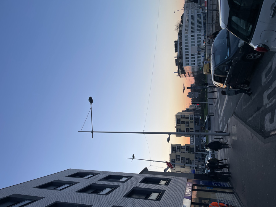 This image depicts an urban street scene in Nanterre, France, at dusk. In the foreground, on the left, is a multi-story building with a light-colored, possibly white, brick facade and dark-framed rectangular windows. Its ground floor features a commercial establishment with a blue sign partially displaying "LAVERIE" (French for laundry service) and "ORY." A person in an orange high-visibility vest is partially visible on the far left, near the entrance of this establishment. A paved sidewalk runs parallel to this building, accommodating several pedestrians walking away from the camera. A group of approximately five individuals is present on the sidewalk, along with at least one solitary walker. Multiple grey metal streetlights are positioned throughout the scene. The most prominent one stands centrally, with a horizontal arm extending to the right, holding a light fixture. A shorter streetlight is visible further back on the left. The street in the foreground and midground is an intersection. White markings, including a partially visible "STOP" or "20" on the asphalt, are present. Vehicles include a dark minivan or SUV parked on the right side of the road, facing the camera. A small child, dressed in a light-colored top and dark pants, stands near the front passenger side of this vehicle, appearing to touch or lean on it. Immediately behind this minivan, the rear portion of a white compact car is visible. In the mid-distance, a grey sedan moves away from the camera, and a yellow van is discernible further down the street. Traffic lights are visible at the intersection. The midground and background feature a variety of modern buildings. To the left of center, two multi-story buildings with light-colored facades and numerous windows appear to be residential or mixed-use. To the right, a larger, white commercial building with a flat roof and visible rooftop equipment is present. The sky transitions from an orange and light pink gradient near the horizon, indicative of sunset, to a clear blue overhead. The overall environment is an active urban setting with pedestrians, vehicles, and established infrastructure.