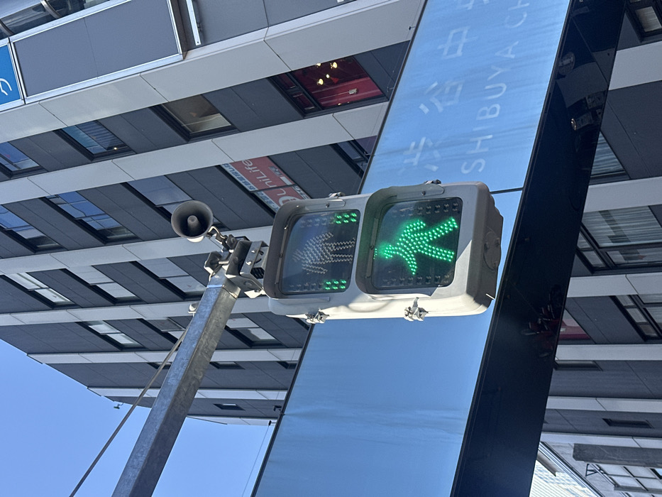 A pedestrian crossing signal shows a green walking figure on the right, indicating it is safe to cross. The left signal displays a faded, almost invisible walking figure. The signal is mounted on a gray pole with a speaker attached. Behind the signal is a reflective sign that reads "SHIBUYA CH." in Japanese. The background includes a modern building with rows of windows, and a clear blue sky is visible in the lower left corner.