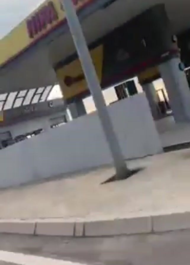 The video begins with a close-up shot of a cracked and damaged asphalt surface, likely a parking lot or roadside area. In the background is a gas station canopy with yellow and red signage. A large crane-like vehicle is parked further back. The camera then moves inside a car, capturing a view through the side window. The car is driving past the gas station and the adjacent roadside. Flags are waving in the wind. Two people are walking on the sidewalk. A discarded object resembling a broken bike frame is visible on the roadside. The sky is cloudy with a hint of sunset visible on the horizon. The video appears to be shot from a moving car on a road passing by a gas station and the surrounding area.