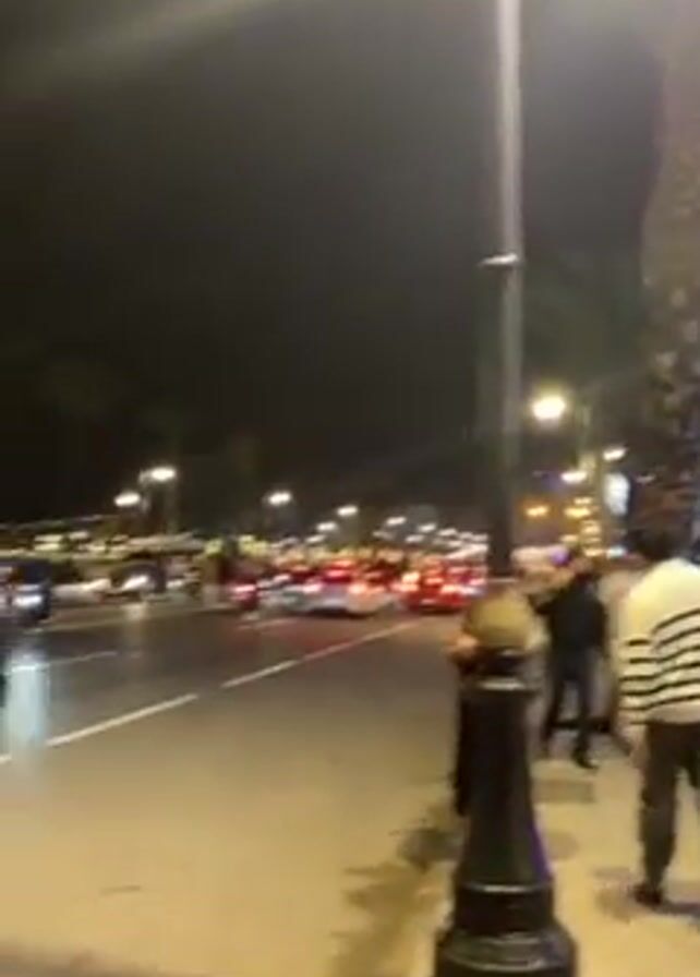 bustling street scene at night. Pedestrians are walking on the sidewalk, while a busy road is filled with cars and motorcycles, many of which are honking. The street is lit by streetlights and building lights. There are palm trees along the street. People are watching the traffic.