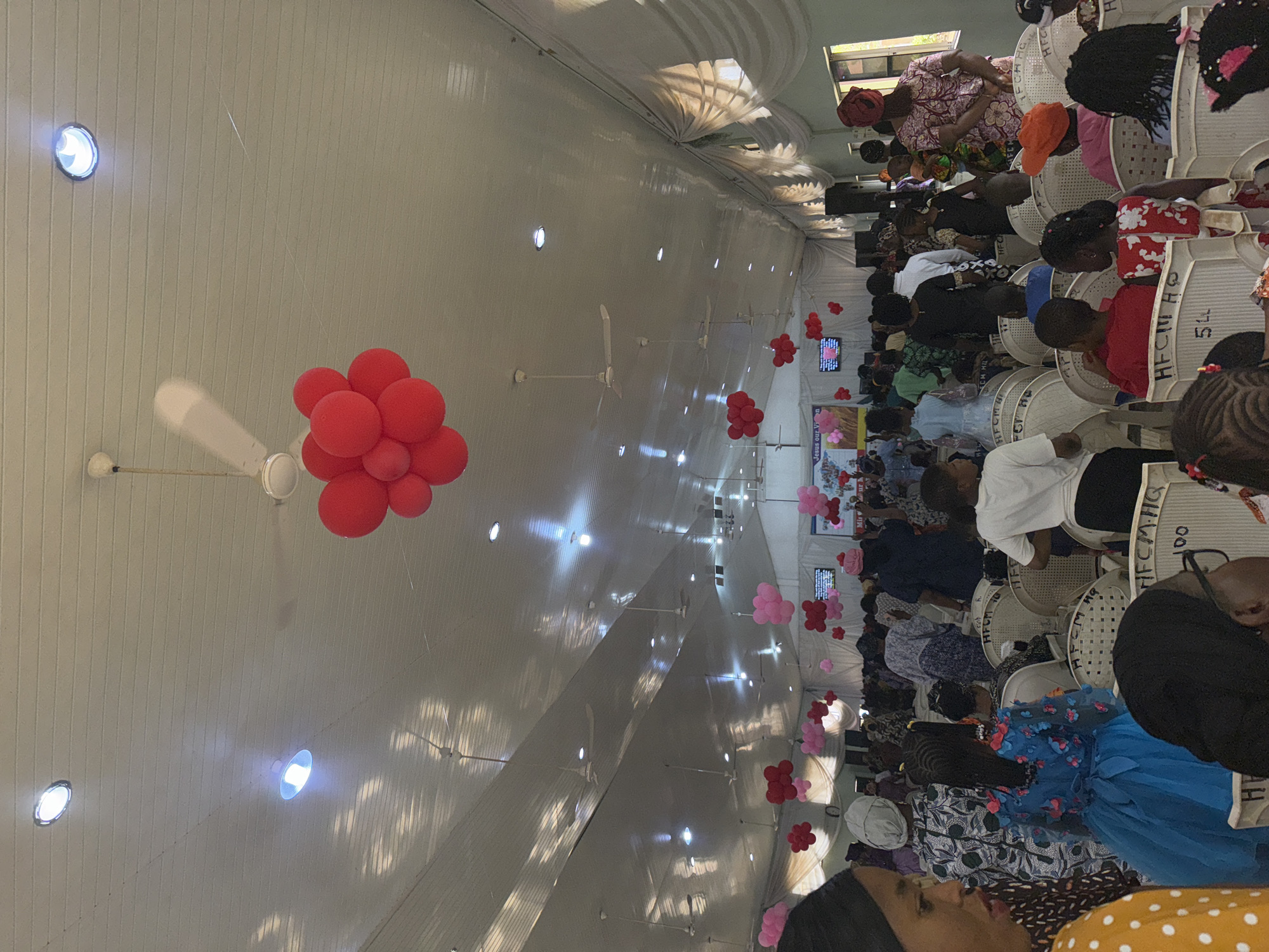 A gathering indoors features rows of people seated in white plastic chairs, with many of the chairs labeled with "HFCM HQ" in black marker, visible on the backs. Many of the participants are children and women, with red and pink balloons decorating the ceiling and walls. On the back wall, a television displays words and pictures, including the phrase, "Jesus our Vion" and what appears to be another sign stating "Mis" and "ur M." The location is Barnawa, Nigeria.