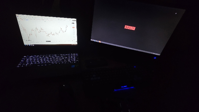 A dark desk setup features two screens. The screen on the left displays a white stock chart, with a keyboard illuminated by white LEDs visible below. To the right, a larger screen showcases a red rectangle with the word "VALVE" on it. Blue lighting subtly illuminates objects on the desk, though most remains obscured by darkness.