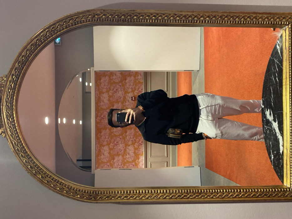 A male individual is depicted in a full-length mirror selfie taken within an interior space. The subject's face is obscured by a black smartphone, which he holds with both hands to capture his reflection. He wears glasses, a dark long-sleeved polo shirt, and white drawstring trousers. A small, brown, patterned shoulder bag is visible on his left side, and an orange bracelet adorns his right wrist. The mirror, ornate with a gold-colored, arched frame, reflects a room featuring a bright orange carpet. The background wall displays an orange/pink and white toile de Jouy-style patterned wallpaper above light-colored wainscoting. Recessed ceiling spotlights provide illumination. A small red emergency exit sign is visible in the upper right corner of the reflection. A dark, possibly marble, half-moon shaped console table forms the base of the mirror. This distinctive interior aesthetic, characterized by the combination of classic elements and vibrant colors, is consistent with and identified as being within the **Clarance Hotel Lille**, in Lille, France.