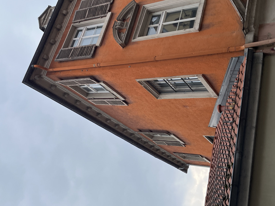 This image depicts a corner view of a building in Heidelberg, Germany, under an overcast sky. The prominent structure is a multi-story building painted a distinct terracotta or deep orange hue. Its exterior features multiple windows with white frames. On the upper floor, several windows are equipped with weathered, dark brown louvered shutters, most of which are open. Below, on the side facing the viewer's left, a window is fitted with black vertical security bars. On the right-facing facade, an ornate architectural detail, resembling a curved pediment with a central decorative element, is positioned above a lower window. A matching orange downspout runs vertically along the building's corner. The roofline is accented with a decorative cornice featuring dentil-like protrusions and a dark gray gutter system. Small bird spikes are visible along the uppermost edge of the roofline. In the lower foreground, a section of a terracotta tiled roof with a metal safety barrier or snow guard and a small vent pipe is visible, belonging to an adjacent, lower structure. No individuals are present in the scene.