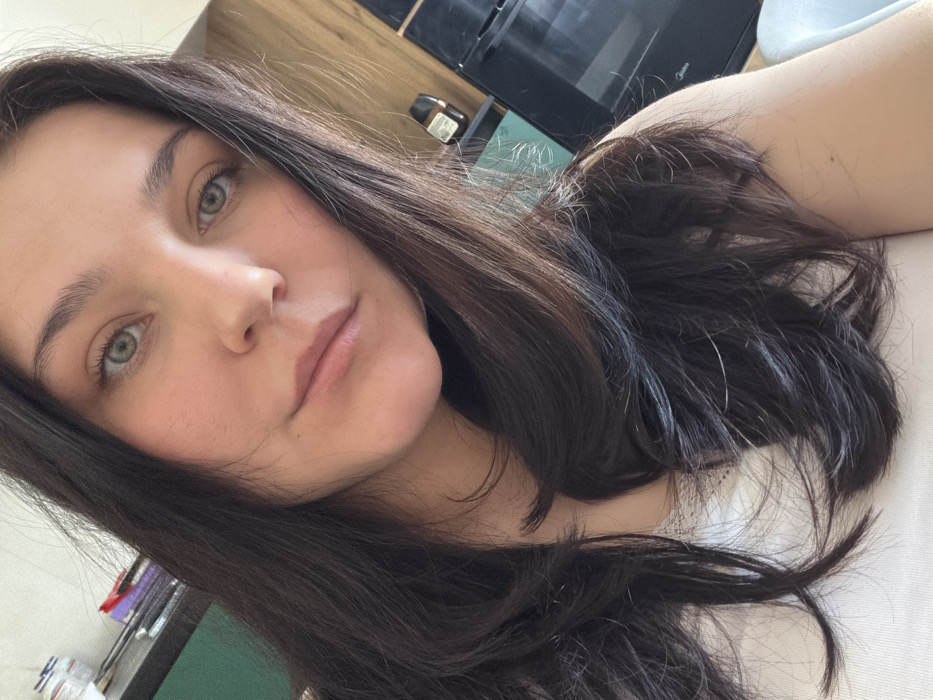 The image displays a close-up, eye-level selfie of an adult female located in an indoor setting within the city of Chaikovsky, Russia. The female subject, centered in the frame, has fair skin, long dark brown wavy hair with a side parting, and light green-hazel eyes. She maintains a neutral facial expression, looking directly into the camera. Her cheeks show a slight blush, and her lips appear lightly colored. She is wearing a white garment, possibly a tank top, featuring subtle lace trim visible at the neckline. The background on the upper left side includes a dark surface, likely a countertop, on which a white cylindrical container, a dark rectangular item, and a partially visible purple object are situated. A green surface, possibly a wall or cabinet, is positioned behind these items. To the upper right, a wooden-textured wall or cabinet is visible. Below it, a black Midea brand electronic appliance with a reflective glass door, consistent with an oven or microwave, is positioned on a dark surface, alongside a dark bottle or dispenser. The lower right portion of the background contains a light-colored, soft object, possibly a cushion or part of a chair. The scene is illuminated by what appears to be natural light.