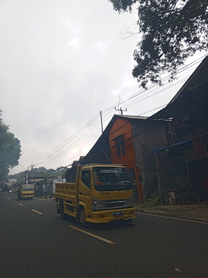 The image depicts a street scene with an overcast sky. In the foreground, a yellow light-duty flatbed truck, consistent with a Mitsubishi Fuso Canter model, moves towards the viewer on the right side of an asphalt road. The truck exhibits motion blur, indicating movement, and has a visible front license plate displaying characters consistent with Indonesian vehicle registration (e.g., "B 9483 KKB"). Further down the road, another yellow light-duty truck is visible, moving in the same direction. On the right side of the road, a series of buildings are present. The closest structure is a dark-colored building with a textured facade and an extended awning. Behind it stands a multi-story building featuring an orange-painted upper gable facade with a dark window. Utility poles and power lines traverse the scene above these structures. Lush green foliage from trees is visible in the upper right and along the left side of the road. No individuals are clearly discernible. Based on the visible vehicle type, license plate format, and architectural styles, the visual evidence within this image is inconsistent with Qorday, Kazakhstan, and strongly suggests a location within Southeast Asia, likely Indonesia.