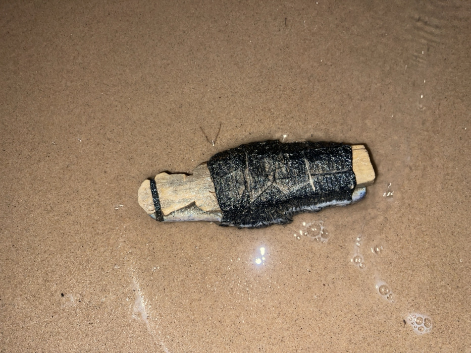A piece of driftwood lies on a sandy beach, partially submerged in shallow water. The wood is light in color at both ends, with a dark, rough texture in the middle, possibly due to a coating or natural weathering. A thin, dark band encircles one of the lighter ends. The sand is smooth and wet, with small bubbles visible near the wood. A single V-shaped piece of debris is visible in the sand behind the wood.