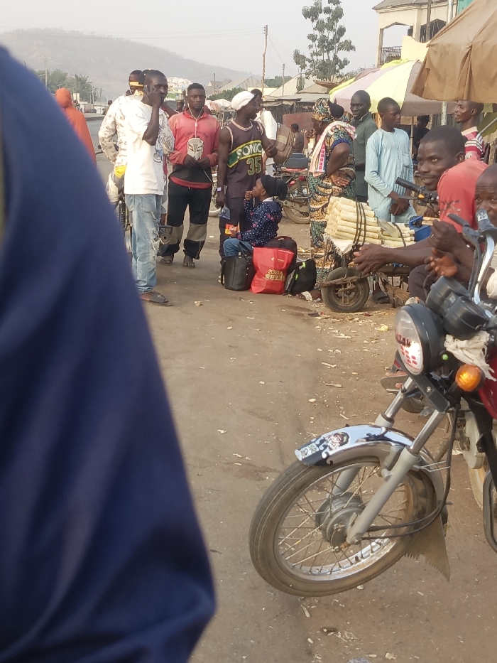 A bustling outdoor scene captures a group of people congregated on a dusty street, with a motorbike positioned prominently in the foreground. Several individuals are standing and conversing, while others appear to be waiting, possibly for transportation. A child sits on luggage near a man wearing a Sonic the Hedgehog jersey. A cart laden with bundles rests nearby, and the motorbike's front fender is adorned with stickers. The backdrop features buildings and hills, suggesting a busy local market or transit point.