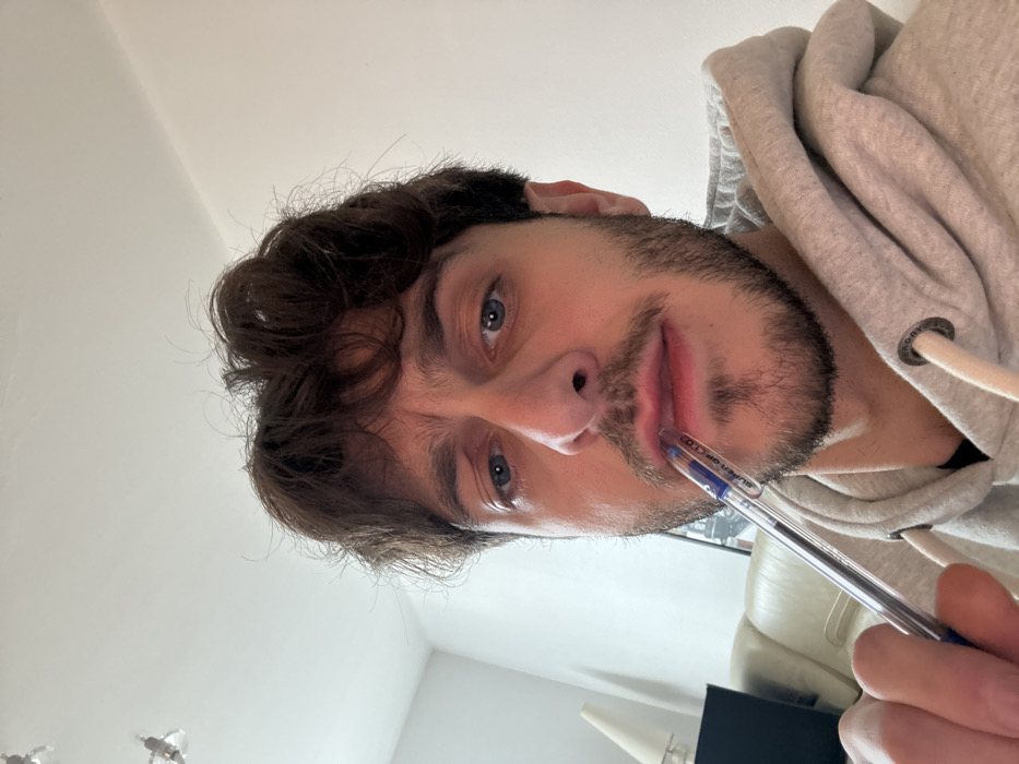 close-up, head-and-shoulders view of a young adult male, situated indoors in Strasbourg, France. The subject, likely in his 20s or early 30s, possesses dark brown, wavy hair and blue eyes, with a light beard and stubble on his face. He wears a light grey hooded sweatshirt featuring white drawstrings. A clear ballpoint pen, visibly marked "SUPER-GP 1.0", is held in his right hand with its writing tip positioned between his lips. His gaze is directed forward, towards the viewer, with a slight furrow in his eyebrows. The background consists of plain white walls and a white ceiling, from which two modern, metallic light fixtures descend. To the left, part of a light-colored upholstered sofa or armchair is visible, along with a partial view of a white lamp shade and a black rectangular object resting on the furniture.