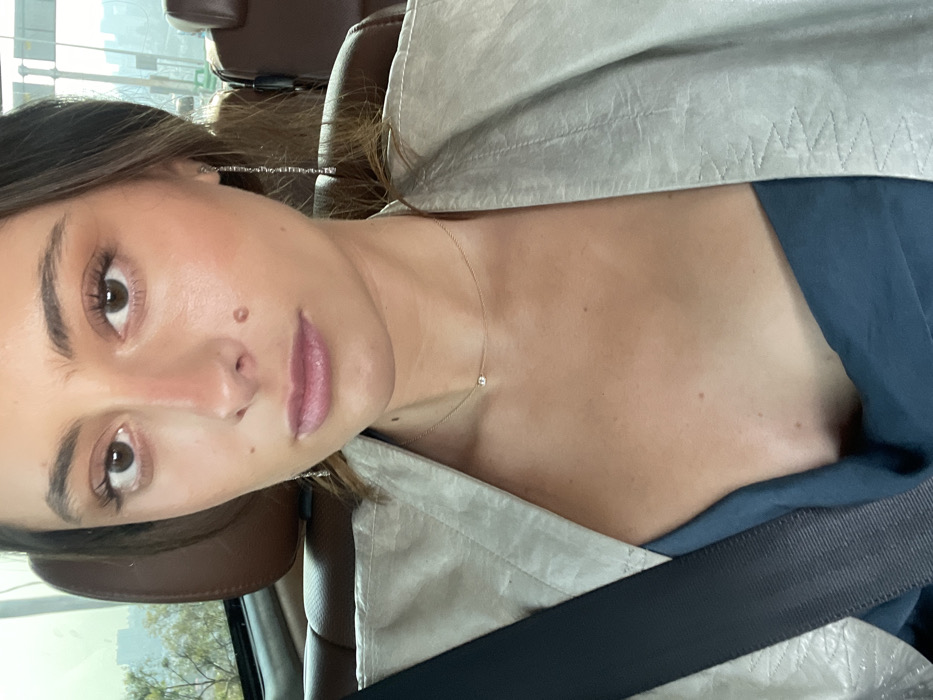 A woman with light brown hair and eyes, fair skin, and a mole on her nose is seen from the shoulders up. She wears a blue top, light-colored jacket, and a delicate gold necklace. A seatbelt crosses her chest. She appears to be seated in a car, with part of a brown leather seat visible behind her head and a blurred cityscape outside the window. The image is brightly lit and taken at a slightly tilted angle.