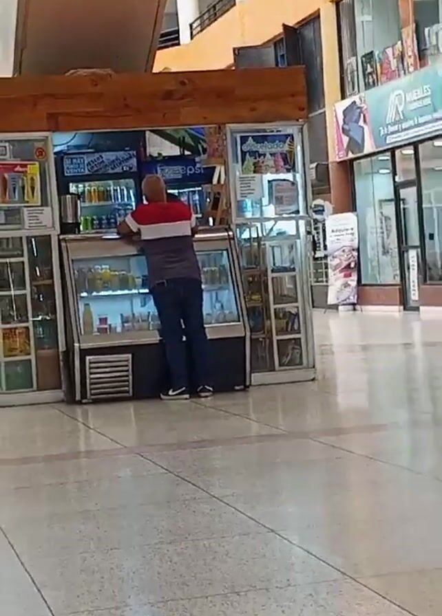 interior of a shopping mall. The mall has a multi-story design. A man stands at a refreshment stand, which has refrigerated display cases. Several people are walking through the mall. Two men walk together while looking at a document. Three women walk away from them. A stack of large speakers sits against the wall.