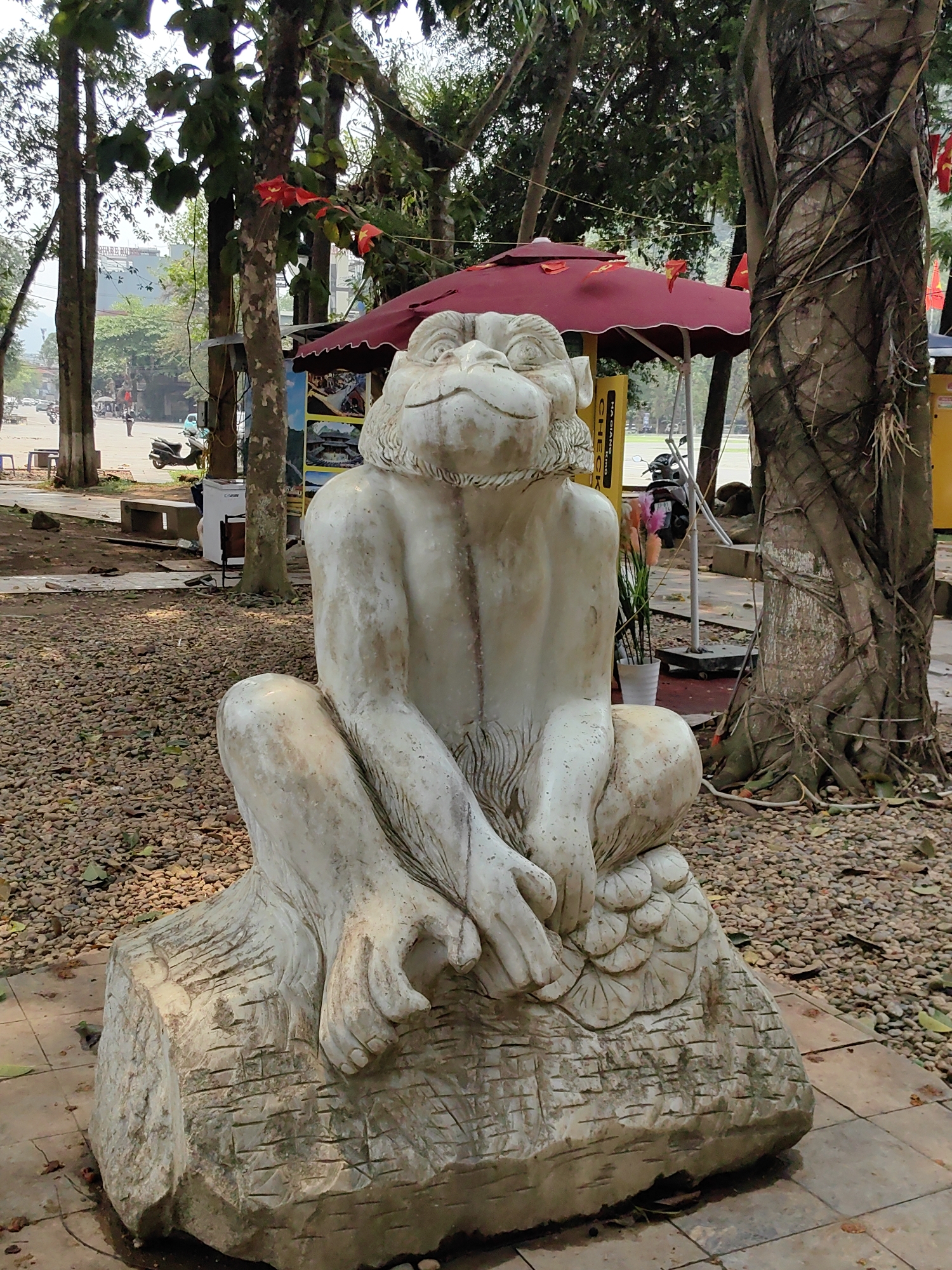 The image depicts a seated monkey statue in a park in Thành phố Hà Giang, Vietnam. The statue is made of light-colored stone and sits on a rough-hewn base. The monkey is posed with its hands resting on its knees. Behind the statue, there are several trees, one of which has vines growing on its trunk. A red umbrella provides shade in the background. Further in the background, there is a street with motorcycles and pedestrians. A building is visible in the distance. The ground around the statue is covered with small pebbles and some tile. There are several benches.