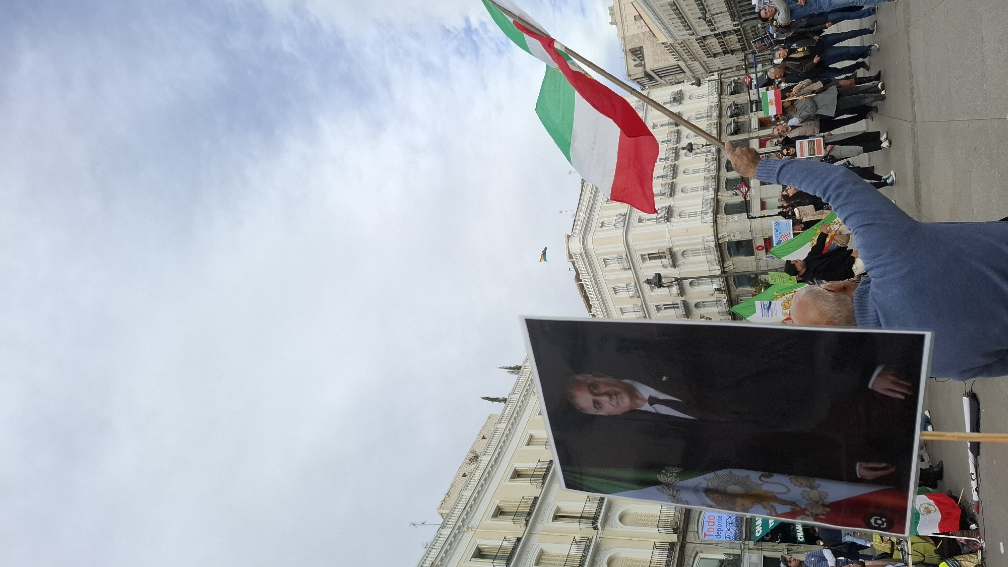 A medium, upward-angled shot depicts a demonstration in Madrid, Spain. A person with balding gray hair, wearing a blue sweater, is holding an Iranian flag and a sign with a portrait of a man in a suit with the Iranian flag. A crowd of people stands behind them, holding flags and signs. The sky is overcast, and buildings are visible in the background. The location is the Puerta del Sol, recognizable by the architecture.