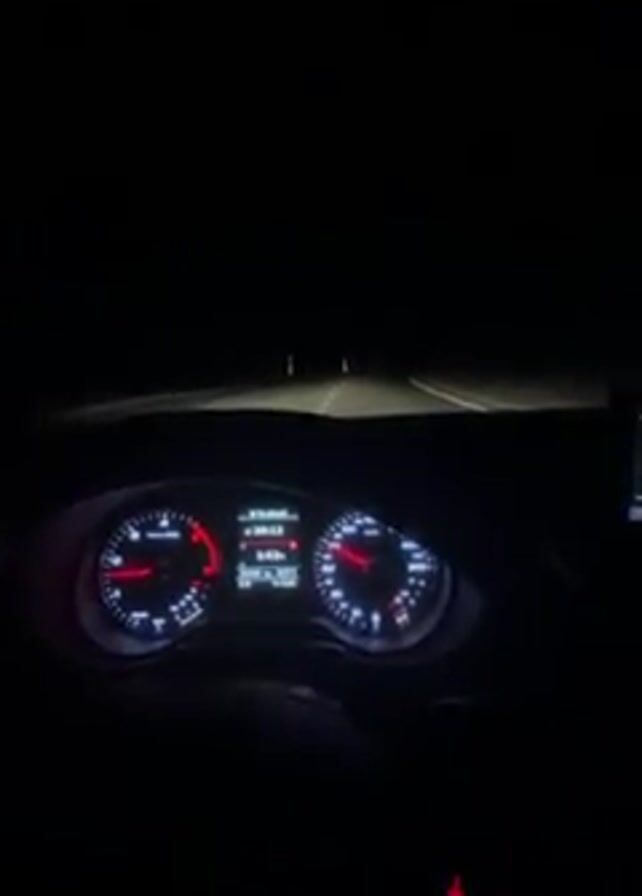 dashboard from the driver's perspective of a car at night, illuminated by the headlights on a dark road. The gauges and display panel of the dashboard are clearly visible. There are no other people in the video other than the implied driver. The road ahead stretches into the darkness, marked by lane markings and other car lights in the distance. The car appears to be moving at a moderate speed. Music is playing in the background.
