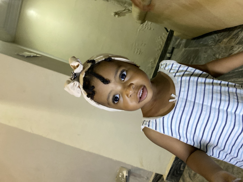 A young child with a light skin tone is facing the camera, slightly tilted. They wear a cream-colored head wrap with a bow and have dark braids framing their face. The child is smiling, revealing their teeth. They are dressed in a white and blue striped sleeveless top with a delicate trim. The background consists of a light-colored wall and floor. The lighting is bright.