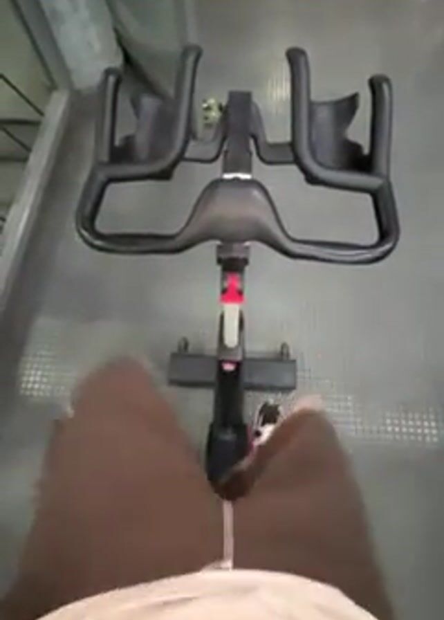 person sitting on a stationary exercise bike. The camera is positioned above, looking down at the person's legs and the bike's handlebars. The person is wearing brown shorts and what appears to be a white t-shirt. They are actively pedaling. The bike has black handlebars with two water bottle holders. The floor is gray and has a checkered pattern.