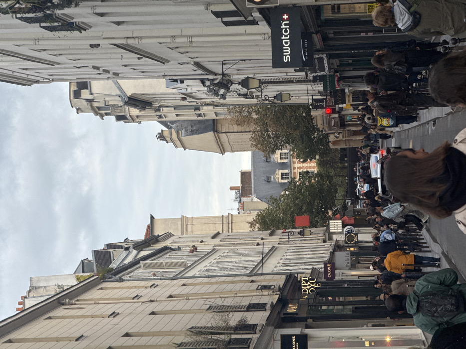 An eye-level photograph depicts a bustling street scene on Rue Saint-Honoré in Paris, France, under an overcast sky