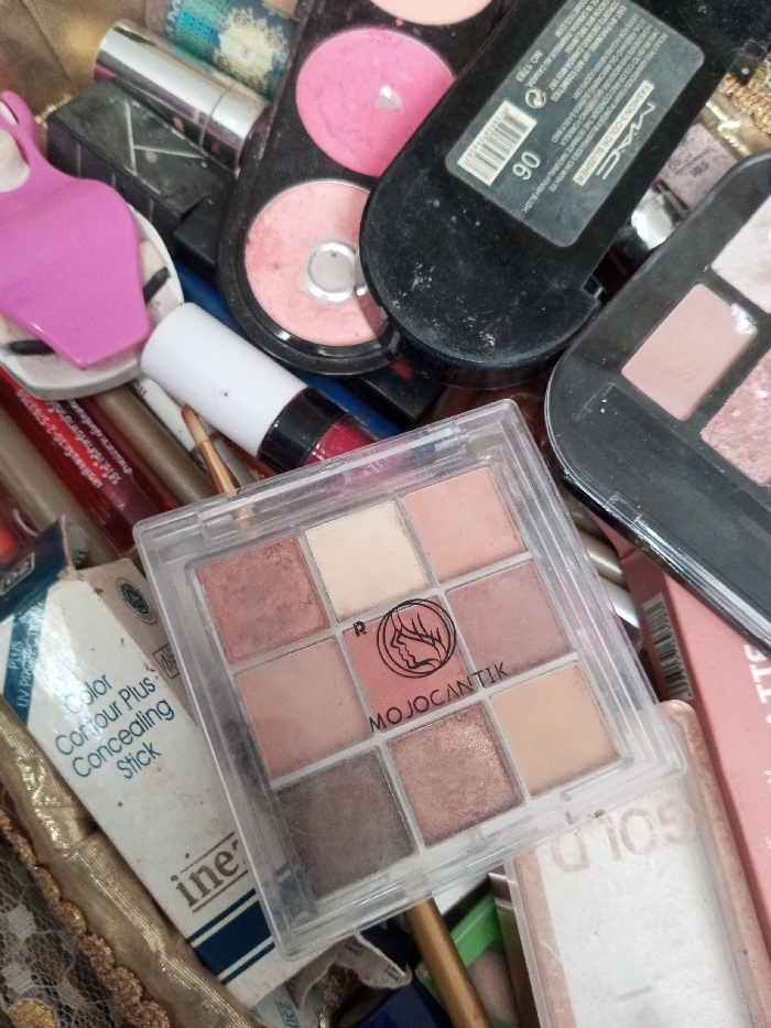 - "The scene depicts a close-up, overhead view of a collection of assorted cosmetic products piled together, likely within a cosmetic container or on a cluttered surface in Qarabucaq qəsəbə, Azerbaijan" by FM-P422V2, licensed under CC BY 4.0
