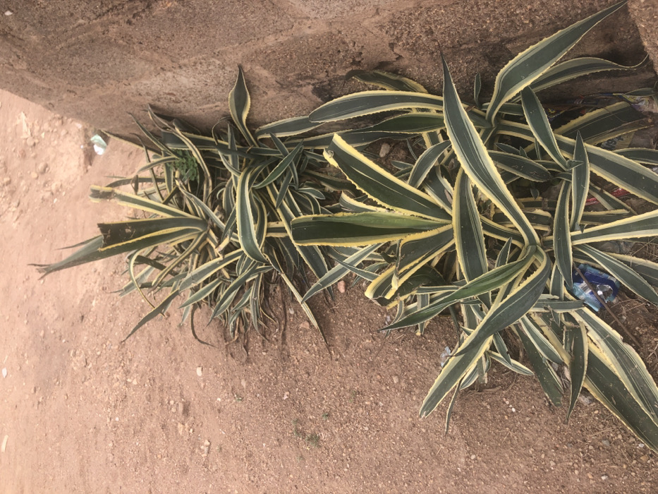 - "The image displays a forensic view of a linear arrangement of variegated agave plants (likely *Agave americana 'Marginata'* or a similar species) positioned along an unpaved, reddish-brown dirt path in the city of Oshogbo, Nigeria" by FM-R0m5T2, licensed under CC BY 4.0